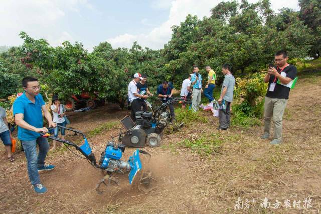 “看到了現(xiàn)代果園的希望?!弊岦S斌民感嘆的是位于從化區(qū)鰲頭黃羅村的綠色家園荔枝生產(chǎn)示范基地。在這里,掘孔機(jī)、中耕管理機(jī)、肥料撒播機(jī)、多功能割草機(jī)、樹枝粉碎機(jī)、高枝修剪機(jī)、伸縮式修剪鋸、搬運(yùn)車、高空作業(yè)機(jī)、各類噴霧直播機(jī)械等60余臺(tái)農(nóng)業(yè)機(jī)械設(shè)備進(jìn)行了展示和演示,分別用于解決山地果園運(yùn)輸、果園采摘、果園殘枝利用、果園管理等機(jī)械化應(yīng)用問題?!罢鸷?!”韓沛新參觀后感嘆道,他認(rèn)為果園機(jī)械化采摘演示尤其壯觀。農(nóng)業(yè)機(jī)械化的實(shí)現(xiàn)能解放勞動(dòng)力,對(duì)荔枝產(chǎn)業(yè)乃至水果產(chǎn)業(yè)都意義重大。