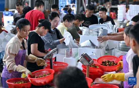 5月22日,工人在位于海口的海南紅明農(nóng)產(chǎn)品(荔枝)交易中心打包荔枝。