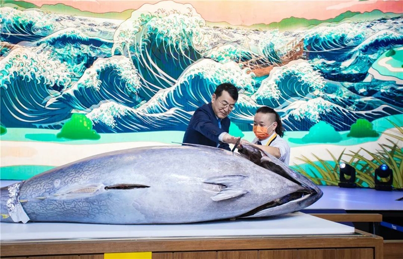 是明芳為“藍(lán)鰭金槍魚(yú)開(kāi)魚(yú)秀”開(kāi)啟第一刀。