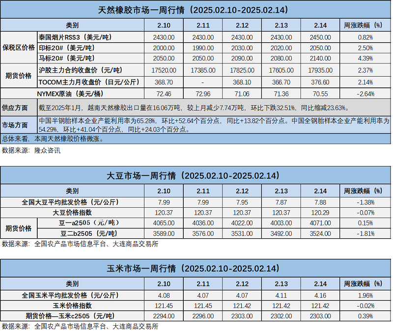 天然橡膠、大豆、玉米市場一周行情(2025.02.10-02.14)