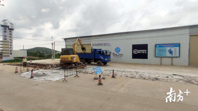 高州市根子鎮(zhèn)易時代荔枝電商產品處理中心前工人們正對路面進行修整
