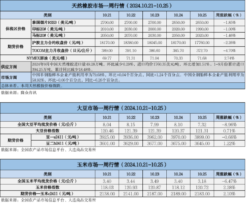 天然橡膠、大豆、玉米市場(chǎng)一周行情(2024.10.21-10.25)