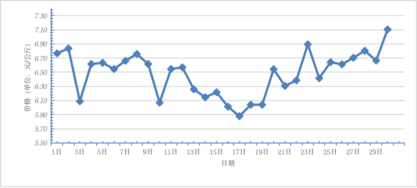 4月,全國重點監(jiān)測農(nóng)產(chǎn)品批發(fā)市場香蕉總交易量達 2.1萬噸,同比下降77.4%,環(huán)比下降8.7%;總交易價值 16739.6萬元,同比下降66.3%,環(huán)比上漲5.0%。日平均價格最高為7.1元/千克,最低為5.9元/千克,全月平均價格為 6.5元/千克,同比上漲20.4%,環(huán)比上漲10.2%(每日價格變化如圖)。