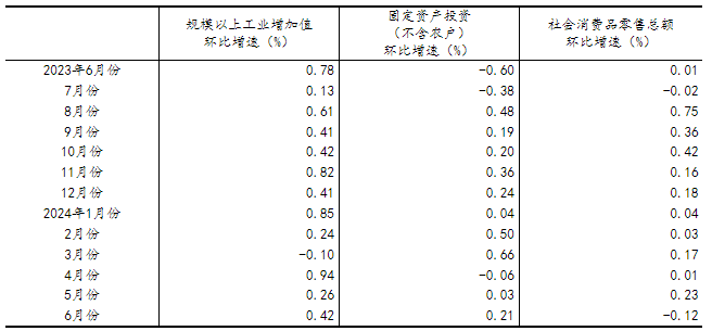 (2)根據(jù)季節(jié)調(diào)整模型自動修正結(jié)果,對近一年來各期國內(nèi)生產(chǎn)總值、規(guī)模以上工業(yè)增加值、固定資產(chǎn)投資(不含農(nóng)戶)、社會消費(fèi)品零售總額環(huán)比增速進(jìn)行修訂。修訂結(jié)果及2024年二季度GDP環(huán)比數(shù)據(jù)、2024年6月份其他指標(biāo)環(huán)比數(shù)據(jù)如下: