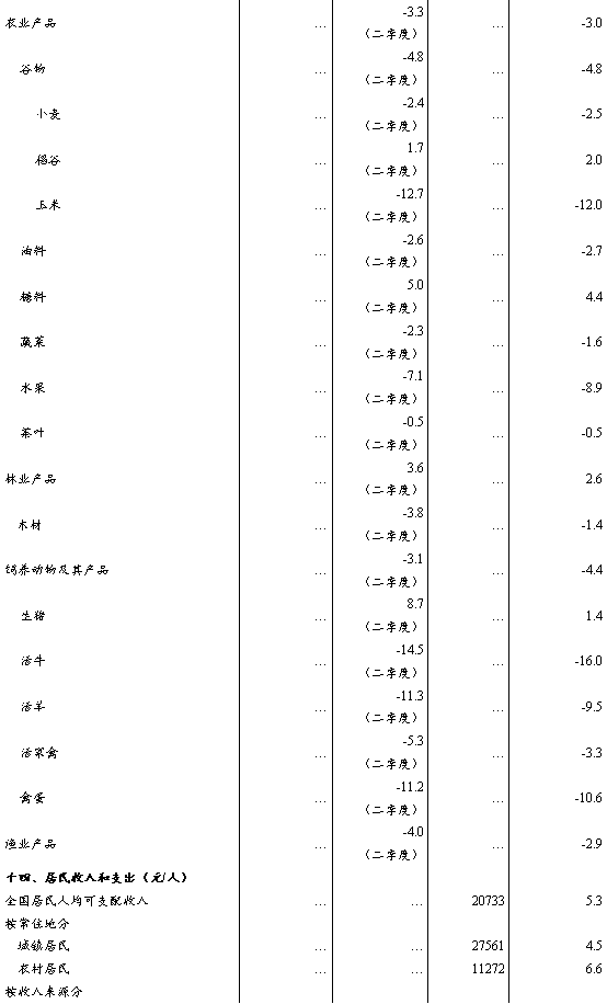 上半年,農(nóng)業(yè)(種植業(yè))增加值同比增長4.0%。夏糧生產(chǎn)再獲豐收。全國夏糧總產(chǎn)量14978萬噸,比上年增加363萬噸,增長2.5%。上半年,豬牛羊禽肉產(chǎn)量4712萬噸,同比增長0.6%,其中,牛肉、禽肉產(chǎn)量分別增長3.9%、6.3%,豬肉、羊肉產(chǎn)量分別下降1.7%、0.9%;牛奶產(chǎn)量增長3.4%,禽蛋產(chǎn)量增長2.7%。二季度末,生豬存欄41533萬頭,同比下降4.6%;上半年,生豬出欄36395萬頭,下降3.1%。