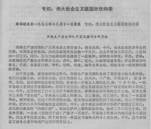 1972年,新華社《偉大社會(huì)主義祖國欣欣向榮》專欄,對西藏生產(chǎn)建設(shè)開發(fā)部隊(duì)的成就做了專題報(bào)道。他們以邊疆為家,以艱苦為榮,在萬里高原上,戰(zhàn)風(fēng)沙,斗嚴(yán)寒,開荒造田,建造林帶、果園。