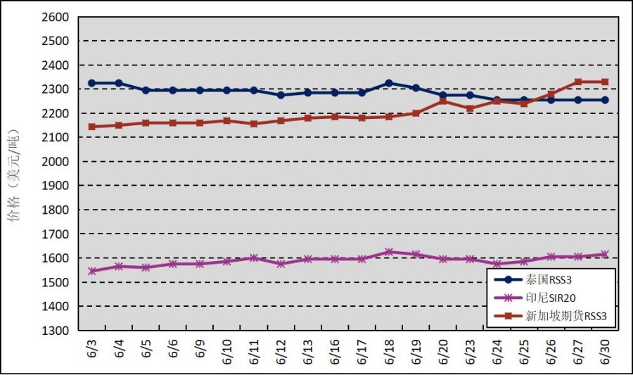 國外主產(chǎn)區(qū):6月,泰國RSS3平均價格為2286美元/噸,環(huán)比下跌16美元/噸,最高價為2325美元/噸,最低價為2255美元/噸;印尼SIR20平均價格為1589美元/噸,環(huán)比下跌93美元/噸,最高價為1625美元/噸,最低價為1545美元/噸;新加坡RSS3期貨主力合約月均結(jié)算價格為2205美元/噸,環(huán)比下跌31美元/噸,最高價為2330美元/噸,最低價為2144美元/噸。