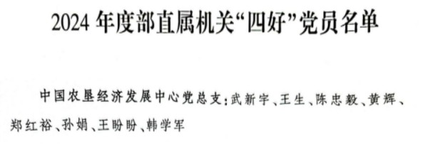 陳忠毅、王生、武新宇、黃輝、孫娟、鄭紅裕、王盼盼等同志獲評(píng)2024年度農(nóng)業(yè)農(nóng)村部直屬機(jī)關(guān)“四好”黨員。