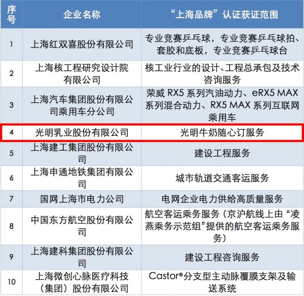 “上海品牌”以世界先進(jìn)標(biāo)準(zhǔn)為引領(lǐng),以此推進(jìn)“上海服務(wù)、上海制造、上海購物、上海文化”四大領(lǐng)域建設(shè),并以此構(gòu)建更高質(zhì)量、高要求的市場要求。2018年光明乳業(yè)首次通過認(rèn)證,成為首家以食品通過認(rèn)證的企業(yè),2022年光明牛奶隨心訂服務(wù)再創(chuàng)佳績,榮耀繼續(xù)。