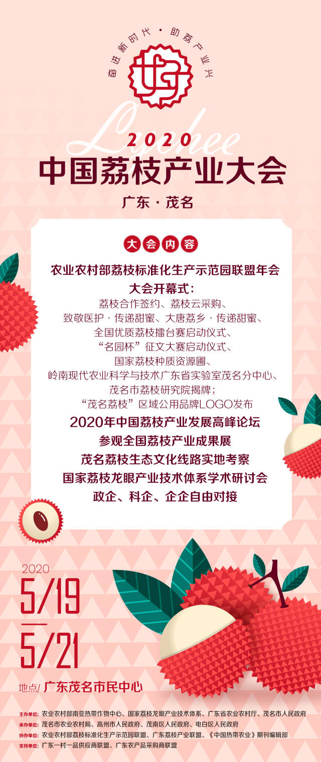 2020年中國(guó)荔枝產(chǎn)業(yè)大會(huì)的主題為“奮進(jìn)新時(shí)代,助荔產(chǎn)業(yè)興”,由農(nóng)業(yè)農(nóng)村部南亞熱帶作物中心、國(guó)家荔枝龍眼產(chǎn)業(yè)技術(shù)體系、廣東省農(nóng)業(yè)農(nóng)村廳和茂名市人民政府主辦,并確定于5月20日在茂名舉辦大會(huì)開(kāi)幕式。
