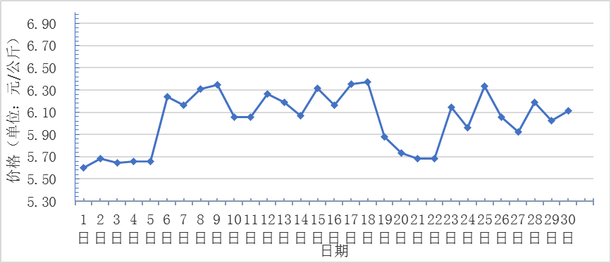 11月,全國重點監(jiān)測農產品批發(fā)市場香蕉總交易量達2.6萬噸,同比下降3.7%,環(huán)比基本保持一致;總交易價值 16391.6萬元,同比上漲8.4%,環(huán)比上漲1.5%。日平均價格最高為6.3元/千克,最低為5.6元/千克,全月平均價格為6.0元/千克,同比上漲7.1%,環(huán)比下降1.6%(每日價格變化如圖)。