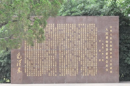 農(nóng)建四師暨淮海農(nóng)場歷史陳列館是在農(nóng)建四師大院舊址上建起來的。走進(jìn)院門,迎面矗立著的是一座由大理石雕刻的碑文?!皩⒐鈽s的祖國經(jīng)濟(jì)建設(shè)任務(wù)賦予你們……當(dāng)祖國需要召喚你們的時候,我將命令你們重新拿起戰(zhàn)斗武器,捍衛(wèi)祖國?!庇慰蛠淼睫r(nóng)建四師大院參觀時,陳列館解說員首先向游客介紹毛主席的這份命令。
