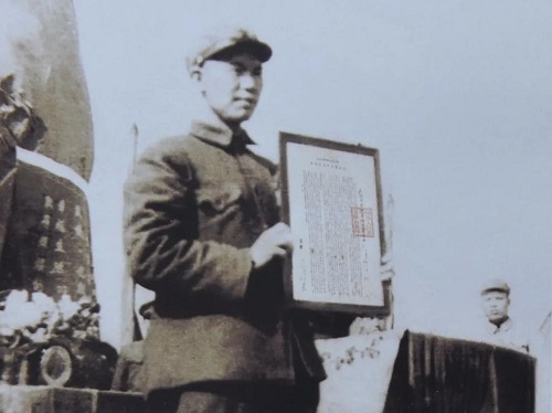 1952年4月20日上午8點(diǎn),102師近萬余官兵正點(diǎn)到達(dá)海門縣三廠鎮(zhèn)廣場,在這里集結(jié)并舉行誓師大會。蘇北軍區(qū)副司令員常玉清,在師首長陪同下檢閱了部隊(duì)后,代表人民革命軍事委員會,向全師指戰(zhàn)員宣布毛澤東主席命令:“中國人民解放軍步兵第102師改編為農(nóng)業(yè)建設(shè)第四師”。