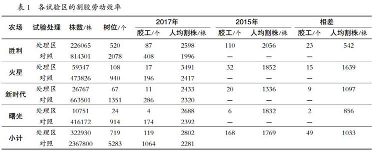 處理區(qū)內(nèi)( s/ 2 d 6 +ET 割制)人均割株比對(duì)照區(qū)(s/2d5+ET 割制)平均多 521 株,效率增幅22.84%;比處理區(qū) 2015 年(s/2d4+ET 割制時(shí))平均多 1033 株,增幅達(dá) 58.40%,有效地提高了勞動(dòng)效率。處理區(qū) 2017 年(s/2d6+ET 割制)比2015 年(s/2d4+ET 割制)減少膠工 49 人,減幅為 29.17%;處理區(qū)人均割樹(shù)位達(dá) 6 個(gè),比對(duì)照區(qū)人均割樹(shù)位多 1 個(gè),較大幅度地減少了膠工人數(shù)。在試驗(yàn)過(guò)程中,2015 年各農(nóng)場(chǎng)推廣s/2d4+ET割制,到 2016年各農(nóng)普遍場(chǎng)推廣了 s/2d5+ET 割制,說(shuō)明農(nóng)場(chǎng)人均割株在逐年增加,也在不斷擴(kuò)崗,對(duì)緩解膠工短缺問(wèn)題具有積極的作用。