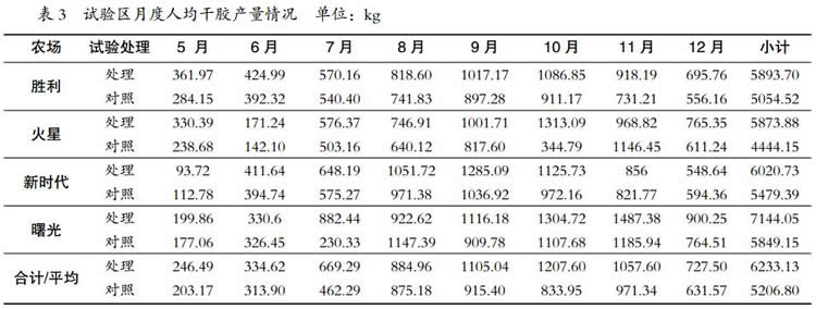 曙光、新時(shí)代、勝利和火星 4 個(gè)處理區(qū)的人均干膠產(chǎn)量分別為 7144.05 kg、6020.91 kg、5893.70 kg和 5873.88 kg,分別比各自對(duì)照高 1294.90 kg/人、541.52 kg/人、 839.18 kg/人和1429.73 kg/人,分別增幅22.14%、9.88%、16.60%和 32.17%。4 個(gè)農(nóng)場(chǎng)處理區(qū)合計(jì)人均干膠產(chǎn)量 6233.13 kg,比對(duì)照高 1026.33 kg/人,增幅 19.71%(表 2)。
