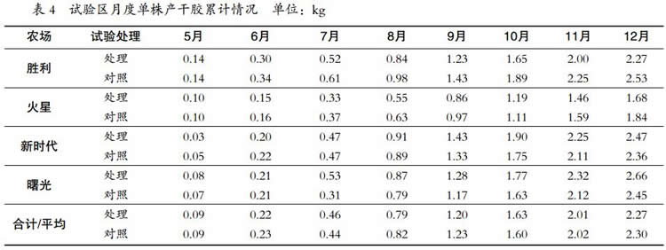 5—12 月處理區(qū)與對(duì)照的單株干膠產(chǎn)量累計(jì)都相差不大;6 月、7 月單株干膠產(chǎn)量累計(jì)分別比上月增加幅度均較小,8 月、9 月、10 月和11 月單株干膠產(chǎn)量累計(jì)分別比上月增加幅度均較大,12 月單株干膠產(chǎn)量累計(jì)比上月增加幅度較?。ū?#8197;4)。