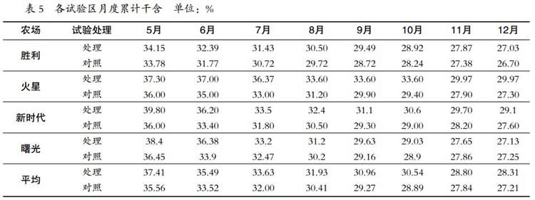 處理區(qū)年平均干含 28.31%,比對(duì)照高 1.1 百分點(diǎn)?;鹦恰⑿聲r(shí)代、曙光和勝利 4 個(gè)處理區(qū)的干含依次分別為 29.97%、29.1%、27.13%和 27.03%,分別比各自對(duì)照高 2.67、1.5、-0.12、0.33 百分點(diǎn)(表 2)。