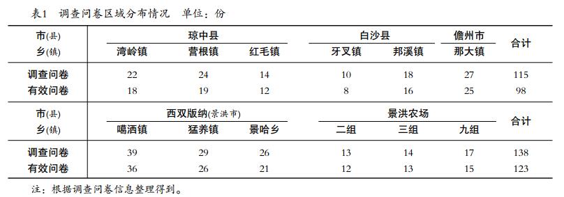 在我國(guó)適宜種植天然橡膠的地區(qū)包括海南省、云南省、廣東省及福建部分地區(qū),其中海南省與云南省天然橡膠產(chǎn)量占全國(guó)總產(chǎn)量的90%以上。因此,本文選擇海南省與云南省內(nèi)的部分民營(yíng)橡膠為研究對(duì)象。根據(jù)本文研究?jī)?nèi)容,以在2013年8月對(duì)云南西雙版納地區(qū),2013年11—12月在海南的瓊中縣、白沙縣、儋州市等地區(qū)考察為基礎(chǔ),天然橡膠產(chǎn)業(yè)經(jīng)濟(jì)崗位的研究人員于2014年6—8月在海南地區(qū)對(duì)民營(yíng)膠農(nóng)割膠制度選擇行為進(jìn)行深入調(diào)查,2014年11月在云南西雙版納地區(qū)對(duì)民營(yíng)膠農(nóng)割膠制度選擇行為進(jìn)行調(diào)研。