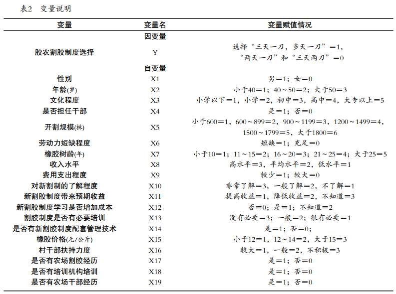 設(shè)計(jì)問(wèn)卷調(diào)查表,實(shí)地調(diào)查膠農(nóng)對(duì)橡膠割制選 擇行為,分別對(duì)海南儋州白沙、瓊中、瓊海,云南西雙版納等地選取不同植膠水平的農(nóng)村進(jìn)行隨機(jī)抽樣調(diào)查,具體變量說(shuō)明見表2。